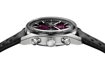 The TAG Heuer Carrera Chronograph smoky purple watch reference CBS2219.FC6607 is 100 meter water resistant and is powered by the Calibre TH20-00, a self winding engine that provides a power reserve of 80 hours. The watch is sure to appeal to both male and female wrists, as one of TAG Heuer’s most attractive unisex watches in the brand’s current portfolio. TAG Heuer experts fit this Carrera watch on a black perforated leather strap, capturing the sporty racing spirit of the collection.