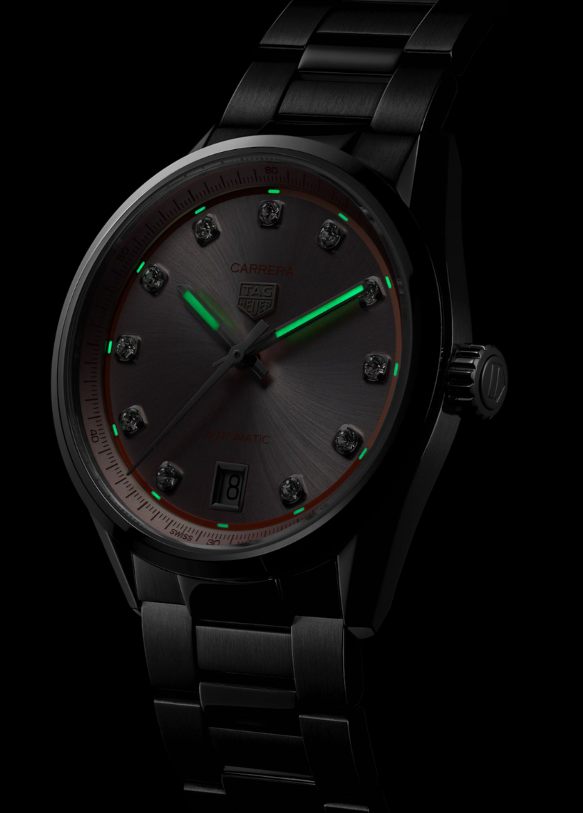 The TAG Heuer Carrera watch reference WBN231D.BA0001 is a simple and straightforward companion for the wrist that will guarantee a touch of style and sophistication to any outfit, smart or casual. The watch is topped with a piece of anti reflective sapphire crystal glass and features a screw down TAG Heuer signed crown to uphold a 100 meter water resistance. To finish, TAG Heuer executes the automatic watch with a robust stainless steel bracelet and a folding clasp. It is the diamonds, however, that bring this lady’s Carrera watch to life. Twelve scintillating stones add a touch of panache to this model, representing each of the hour markers alongside luminous filled central hands.