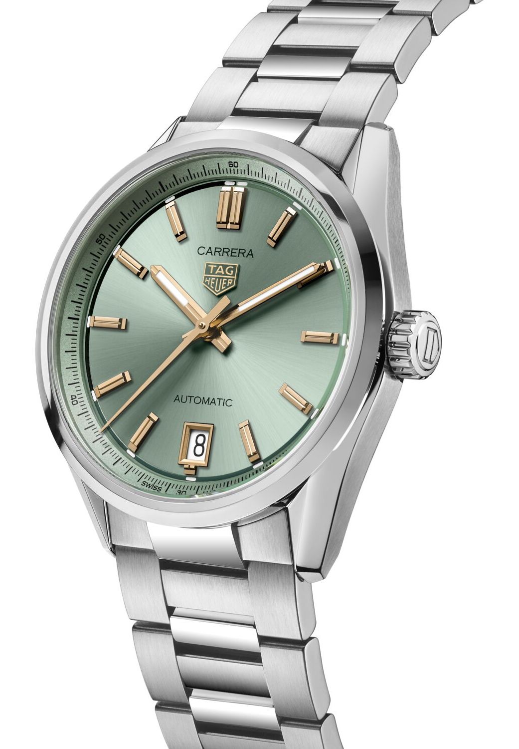 Characterized by its signature H shaped links on a stainless steel bracelet, the Carrera Date watch is a staple for many TAG Heuer watch enthusiasts. This model, measuring a 36mm diameter, is perfect for the female wrist and boasts a stunning sunray brushed pastel green dial with luxurious rose gold plated hands and hour markers. The colour tones of the shimmering green dial and the indulgent golden hues of the appliques are a perfect match for one another in this Carrera Date watch reference WBN2312.BA0001. Stick hour markers classically represent each hour location around the edge of the dial and a set of hour and minute hands gracefully glide over the display, with the ability to glow richly at night thanks to a generous helping of Super LumiNova.