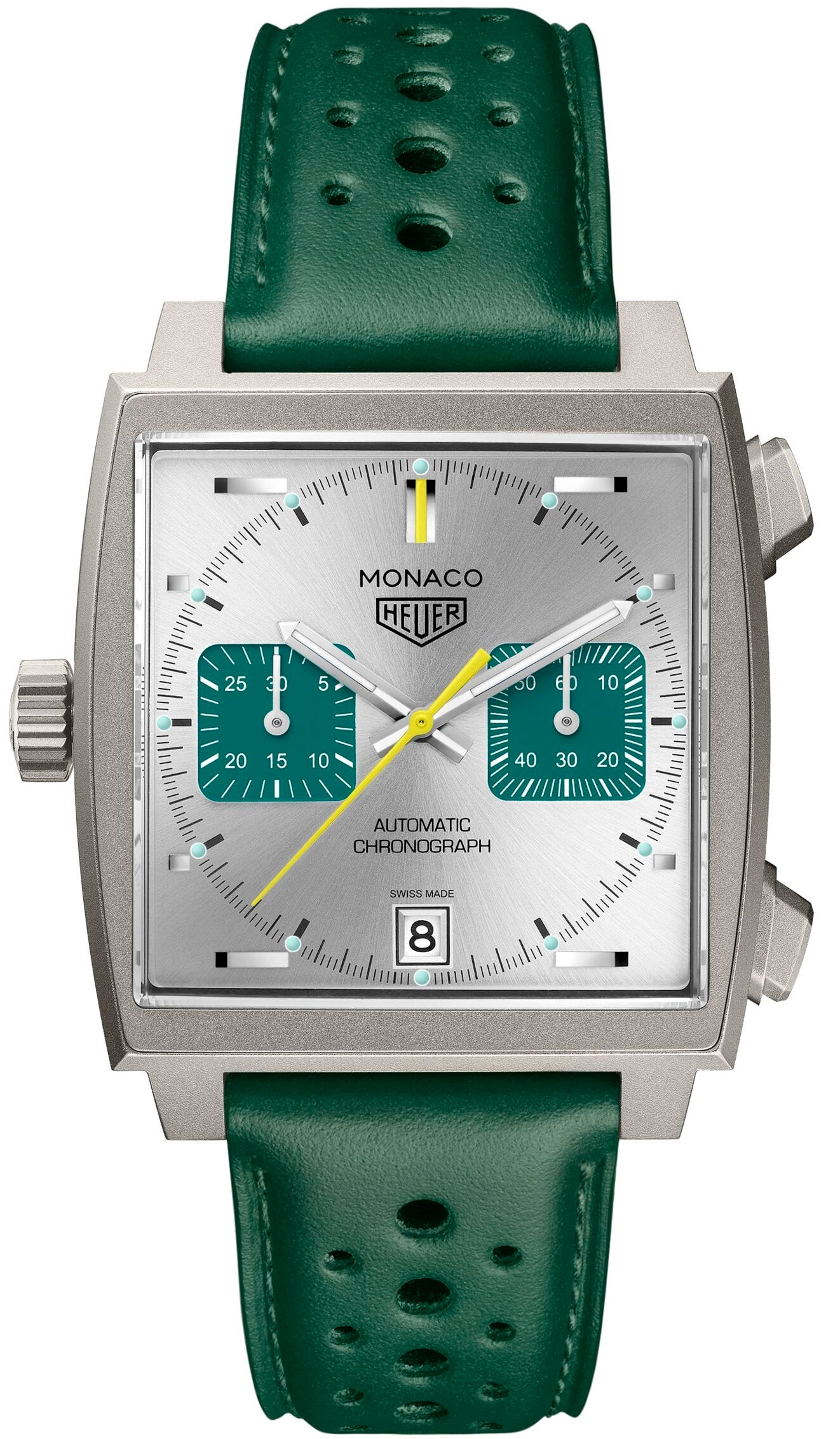 TAG Heuer Watch Monaco Chronograph Racing Green Limited Edition CAW218E.FC6565. Embrace the racing heritage of the TAG Heuer Monaco Chronograph Racing Green. This 39mm watch, inspired by the Racing Green livery of British drivers, features a silver sunray brushed dial with green and yellow accents. The historic Calibre 11 movement, housed in a lightweight titanium case and paired with a green leather strap, underscores its timeless charisma.
