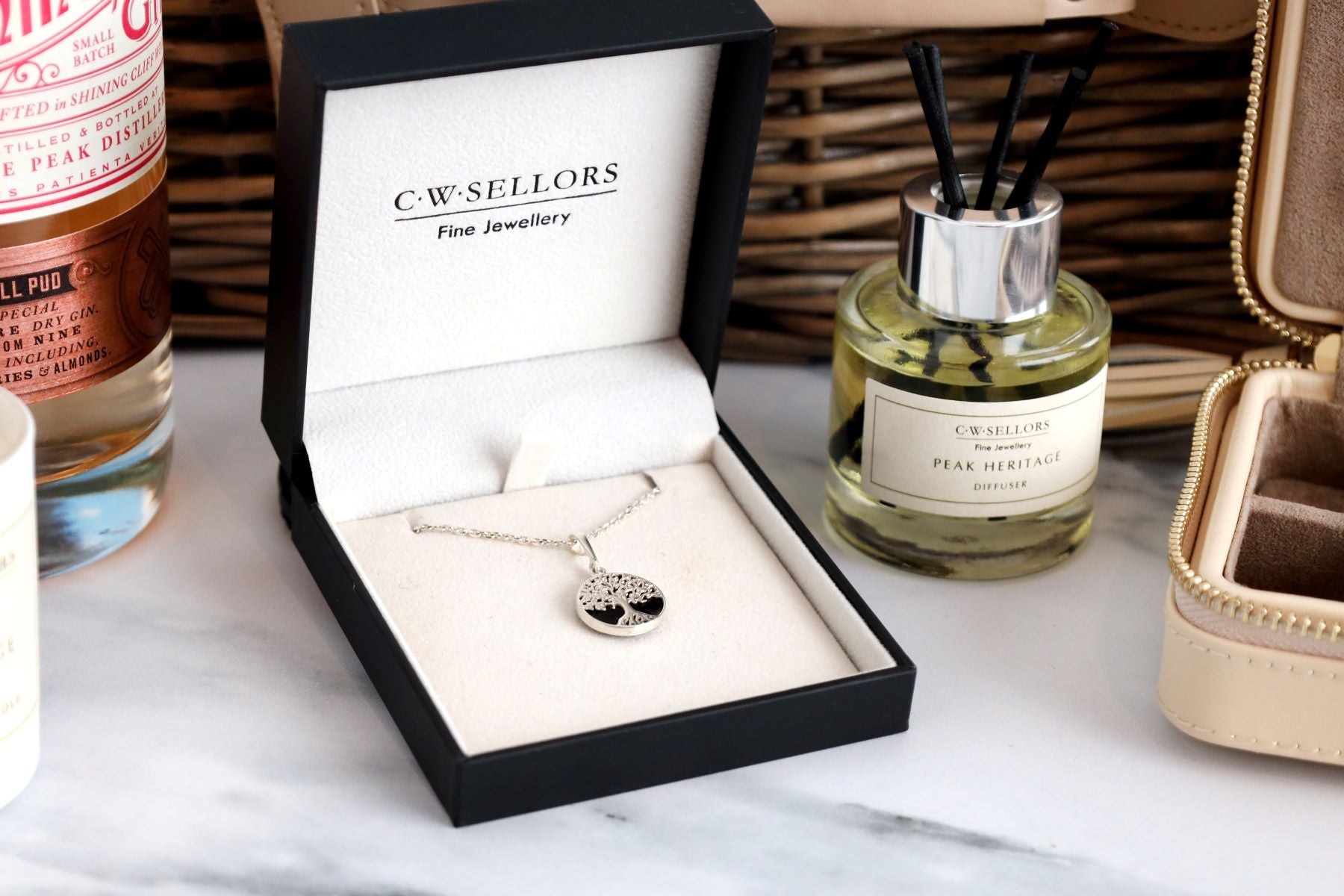 The C W Sellors Ashbourne Hamper is filled with a selection of extra special goodies including our handcrafted necklace featuring our exclusive Tree of Life design. In this necklace design, a silver openworked Tree of life design is placed upon a circular surface of Blue John. Designed and crafted within our very own workshops in Ashbourne, the Tree of Life design is suspended from an 18 inch silver chain. Alongside this, the hamper also features a C W Sellors travel case for carrying the necklace, as well as a rose quartz or amethyst Peak Heritage candle and diffuser. A box of Holdsworth Milk Chocolate Marc De Champagne Truffles finishes the Ashbourne Hamper perfectly, alongside a bottle of Shining Cliff Bakewell Pud Gin with 9 different botanicals and subtle cherry and almond flavours.