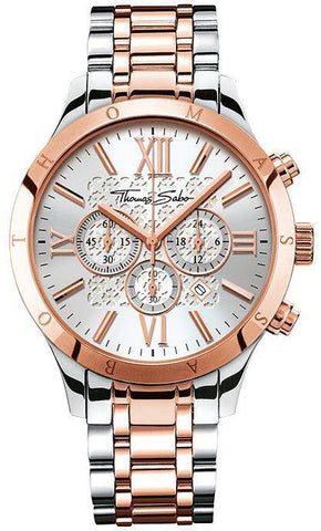 Thomas Sabo Watch Rebel At Heart Mens WA0225-272-201-43. Exquisite classic with a modern twist. The elaborately designed, silver coloured dial stands out with its elegant sunray finish and sophisticated details such as the rebellious cross pattern, they make this chronograph an absolutely timeless statement. The two tone trend of stainless steel and exquisite rose gold colour lends this elegant timepiece a certain je ne sais quoi.̴Ì_