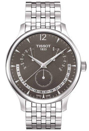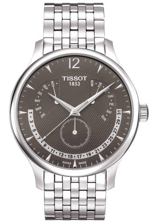 Tissot Watch Tradition Perpetual Calendar. Tissot Tradition Perpetual Calendar is the first watch by Tissot to incorporate a perpetual calendar among its complication. The timepiece is equipped with the brand new ETA G15.561 quartz calibre that is powered by a battery. End of life (EOL) indication is available for the convenience of the wearer. The movement automatically adjusts for leap years, which calls for no manual calendar adjustments. Subsidiary scales provide information about the month and the day of the week. A date scale expands from the 9 o'clock to the 3 o'clock mark. The subsidiary seconds dial is another useful characteristic. Tissot Tradition Perpetual Calendar brags various other practical features like guilloche dial patterns, solid case back, stainless steel crown and domed scratch resistant sapphire crystal glass.