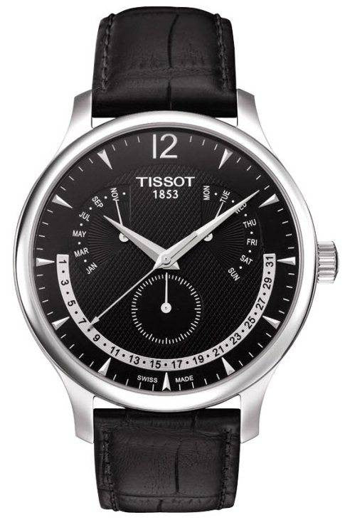 Tissot Watch Tradition Perpetual Calendar T0636371605700. This Tissot Timepiece from the Tradition range is the first one by the brand to include an analog perpetual calendar. It is equipped with the new, Swiss made ETA G15.561 quartz calibre that is powered by a battery. End of life (EOL) indication is available for the convenience of the wearer. The movement automatically takes in consideration leap years, which calls for no manual calendar adjustments. Month and day of the week scales are positioned respectively at the 10 and 2 o'clock marks. A date scale expands from the 9 to the 3 o'clock mark. Additional useful features include subsidiary seconds, black dial, solid case back, stainless steel crown and domed scratch resistant sapphire crystal glass.