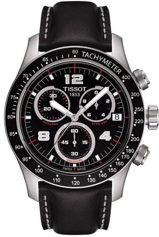 Tissot Watch V8. V8 timepieces from the T Sport range brag resilience and exceptional functionality. This watch is equipped with Swiss made ETA G10.211 quartz calibre that is powered by a battery. Approximate battery life totals 38 months. End of life (EOL) indication is available for the convenience of the wearer. Hands and indices are luminous for improved night time visibility. The chronograph of this Tissot watch comes with a 1/10th of the second, a 60 second and a 30 minute register. A date display appears at the 3 o'clock mark. The fixed bezel has a tachymeter scale. Additional useful features include snap down stainless steel case back, push pull crown and scratch resistant sapphire crystal glass.