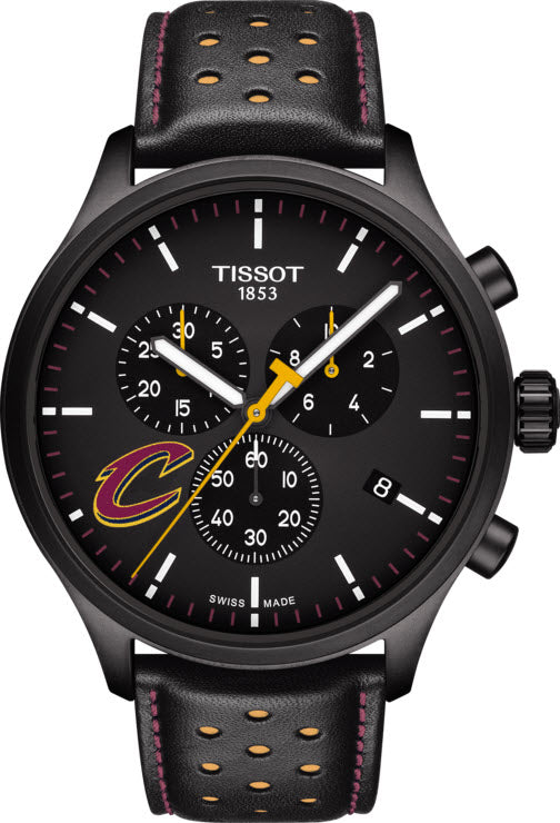 Tissot Watch NBA Cleveland Cavaliers Edition T1166173605101. This very sporty and fashionable large chronograph 45mm collection has the beautiful logo of some of the most popular NBA Teams on the dial.