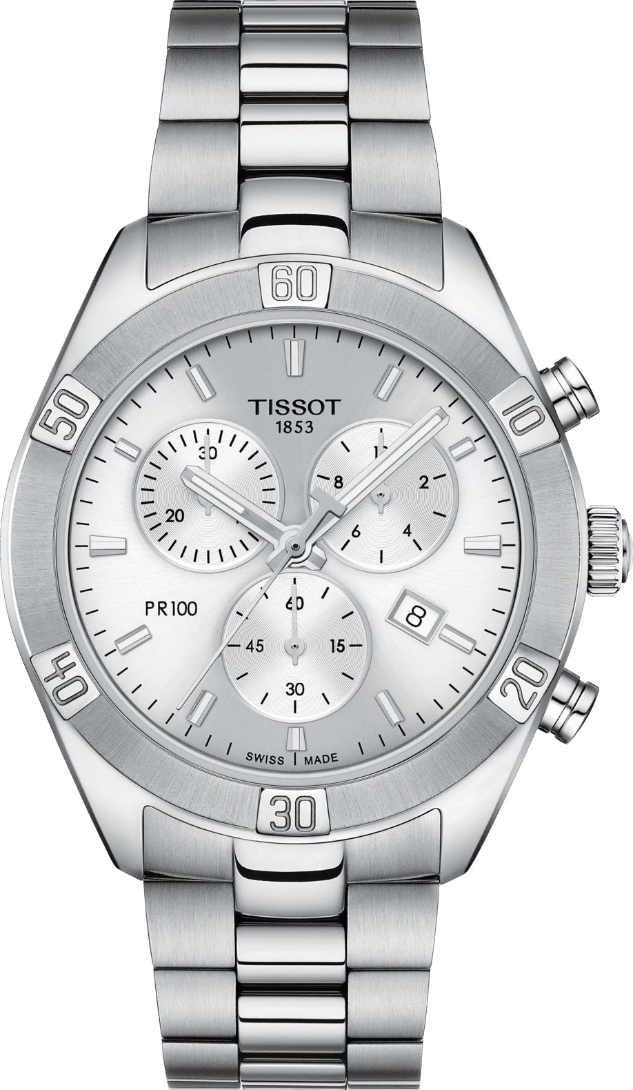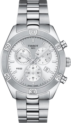 Tissot Watch PR 100 Sport Chic Chronograph T1019171103100. While the PR 100 collection celebrates strength, it does not neglect its feminine aesthetic. With different styles to choose from, every woman will find something to love in these Sport&Chic watches that are also practical, thanks to indexes and hands set with luminescent materials providing perfect visibility. Minimalist fans will be drawn to a pure face, while others, after a touch of luxury, will appreciate the shimmering mother of pearl on the dial and on the counter or sunray dials decorated with dazzling index diamonds.