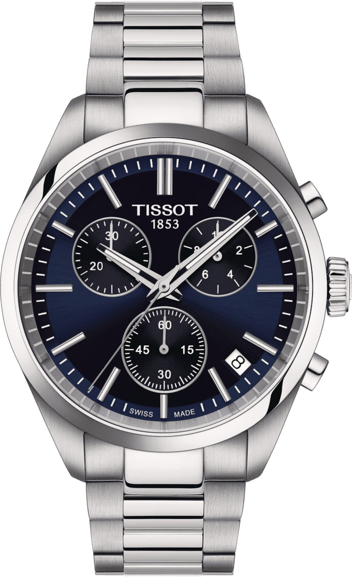 Tissot Watch PR 100 Chronograph T1504171104100. The PR100 collection offers classic quartz chronographs in various colours. These sporty yet classy timepieces feature a polished middle row on the bracelet for a shinier look, a white disc in the date window, and a standard second hand. The G10.212 chrono quartz movement provides precision and robustness, complemented by water resistance up to 10 bar (100 meters/330 feet), and visibility in low-light conditions is guaranteed by the Super-LumiNova® coating on the needle-shaped hands.
