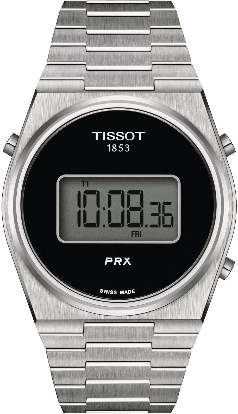 Tissot Watch PRX Digital 40mm T1374631105000. The Tissot PRX Digital, a harmonious blend of the iconic 1978 PRX design and the Tissot Digital Quartz (Calibre 4012), brilliantly exhibits a hybrid of past eras and digital influence. Seamlessly blending retro aesthetics with a contemporary twist, it's the timekeeper for today's trailblazers. The PRX Digital, available in 35mm and 40mm options and in a variety of colours, cater to all wrists, while the multitude of features - dual time zones, day-date, chronograph, and more - cater to all needs. Encased in a shell water-resistant up to 100 metres and fastened with a satin-finish bracelet and a triple-blade folding clasp, these timepieces are crafted for both endurance and comfort. The Tissot PRX Digital collection symbolises a journey through time, a tribute to the past and a toast to the future.