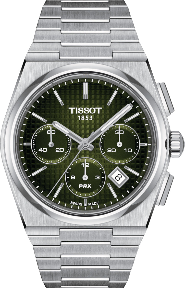 Tissot Watch PRX Automatic Chronograph T1374271109100. Created for those with an eye for design and packed with twenty-first century features in a Tissot case shape from 1978, the PRX Chrono is a must-have on every watch fan’s wish list. This 42mm satin-finished steel watch follows the PRX’s sleek, angular form, adding to the laid-back 1970s sports watch style with a panda dial. The PRX Chrono is powered by the Valjoux A05.H31 calibre, which provides the design with the classic 3, 6 and 9 chronograph dial layout and an extended 60-hour power reserve. Discover this sporty and chic version with its khaki green dial, matching counters and stainless steel bracelet.