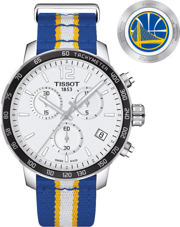 Tissot Watch Quickster NBA Golden State Warriors T0954171703715. Fans will be able to wear the Tissot Quickster NBA watches with pride as they support their favourite team. The pieces have a fitting sporty look with a contemporary teamed coloured Nato strap to match. Each case features a respective team logo, silk printed on the back. The special edition collection includes the Cleveland Cavaliers, Golden State Warriors, Brooklyn Nets, Houston Rockets, Oklahoma City Thunder, Toronto Raptors, Chicago Bulls, Miami Heat, New York Knicks, San Antonio Spurs and Los Angeles Lakers.
