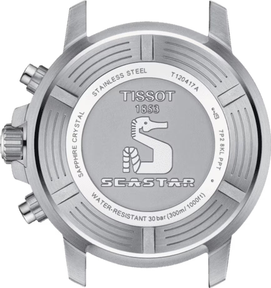 Tissot Watch Seastar 1000 Chronograph T1204171708101. Water resistant to 30 bars, our SEASTAR watches will be the ideal accessory for your underwater and urban adventures. Perfect for diving or everyday activities, these watches are reliable and chic. The epitome of elegance and technology.
