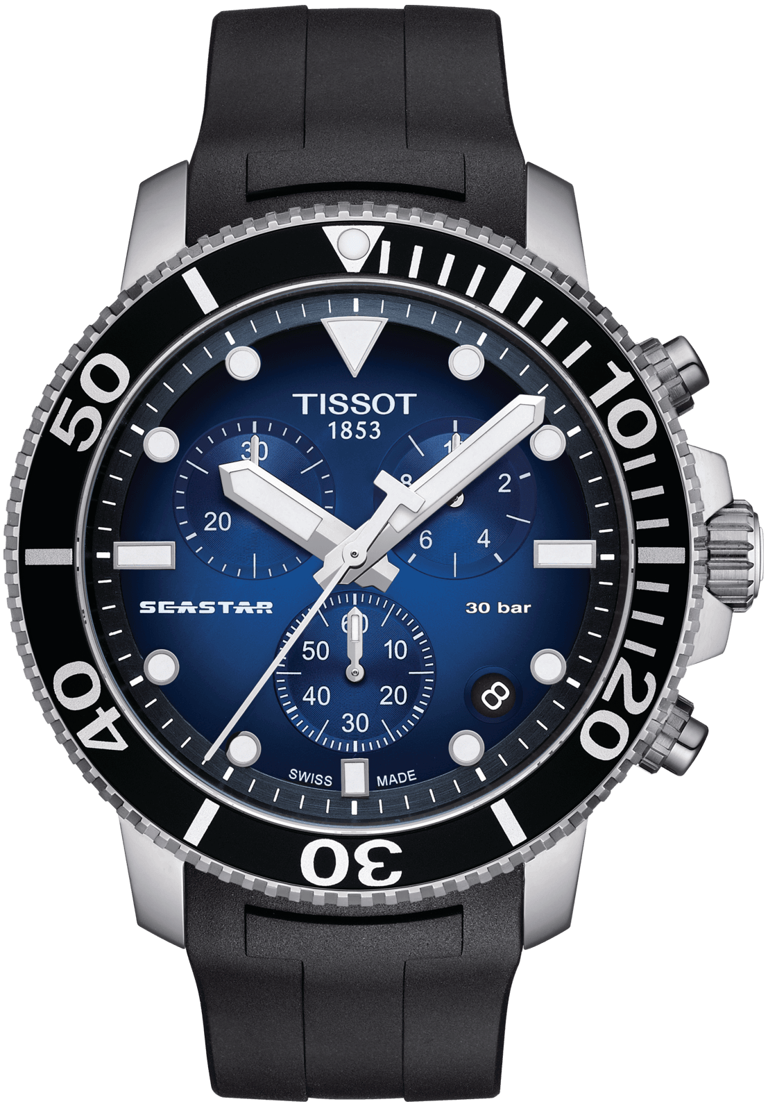 Tissot Watch Seastar 1000 Quartz Chronograph T1204171704100. The automatic choice for divers. With its high water resistance up to a pressure of 300m, screw down crown and caseback as well as its unidirectional ceramic bezel, the Tissot Seastar 1000 is the ultimate diving watch, now combined with the energy of the Powermatic 80 movement.
