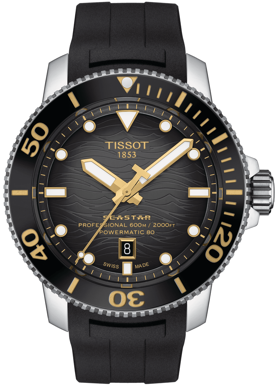 Tissot Watch Seastar 2000 Professional Powermatic 80 T1206071744101. Wherever you go and whatever adventure you find yourself on, you’ll find balance with the Seastar 2000 Professional Powermatic 80 on your wrist. This is a highly technical, assertive watch that’s brimming with easy confidence, whether you take it deep into the urban jungle, or hundreds of metres below the surface of the sea. With its chic, stylish profile, it’s a versatile piece you can wear everyday. But with its muscular architecture, up to 60bar (200m / 2000ft) of water resistance and ISO 6425 (2018) diver’s watch certification, it’s the tool watch you can rely on when you need it most, too. Specifications include a uni-directional rotating bezel with a ceramic bezel insert, a screw-down crown, an automatic helium escape valve and a water-proof black rubber and blue fabric strap. A black or gradient blue to black dial with a wave motif is the symbol of its impeccable underwater credentials.