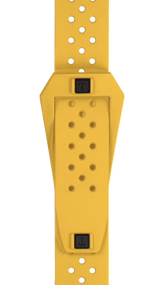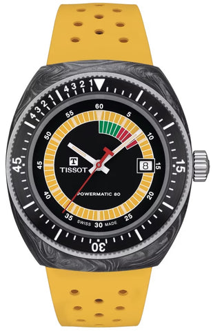 Tissot Watch Sideral S Yellow T1454079705700. Discover the Tissot Sideral, a captivating fusion of vintage allure and modern craftsmanship. The watch features a 41mm wide forged carbon case and a vibrant yellow strap, paying homage to its iconic 1970s roots. The dial displays a multi-coloured luminescent animation, enhancing its unique charm. Water-resistant up to 30 bar (300 meters) and equipped with Super-LumiNova coated indices, the Sideral is a statement piece for trendsetters and history enthusiasts. The interchangeable perforated rubber strap allows for effortless style adaptation. Embrace the extraordinary with the Tissot Sideral.
