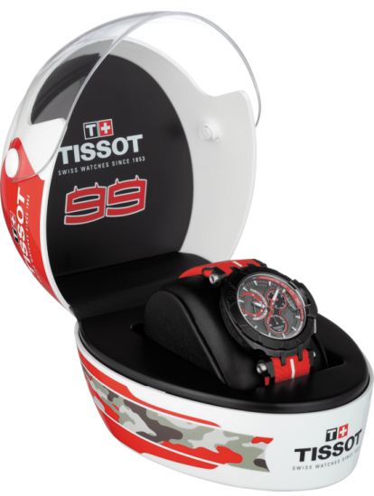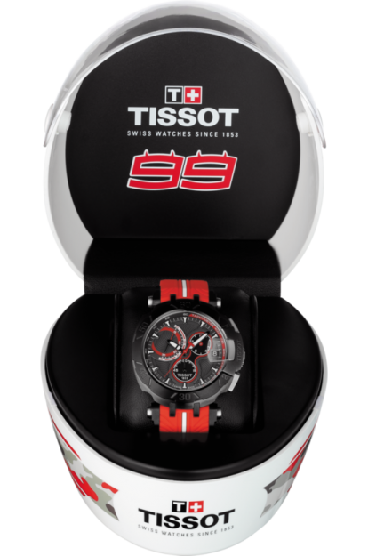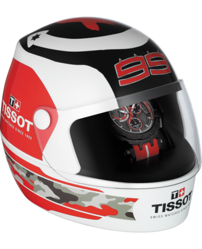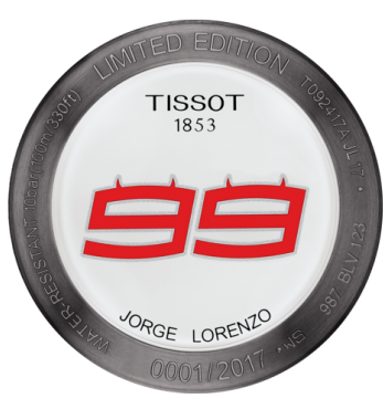 Tissot Watch T-Race Jorge Lorenzo 2017 Limited Edition T0924173706102. Tissot could not honour Jorge Lorenzo without considering his motorbike, which is why many of the watchs details are taken from the two wheeled machine. It is also what makes the essence of the watch. It has a brake disc illustrated by the bezel, while tyre treads are left on the bracelet. The details go as far as suspension rodes depicted in the attachments of the bracelet to the case, and pushers like footrests. The owner of this watch will be one of only 2017 worldwide. Confirming the exclusivity of this piece is Jorge Lorenzos very own logo silk printed on the caseback and the special helmet presentation box it comes in.