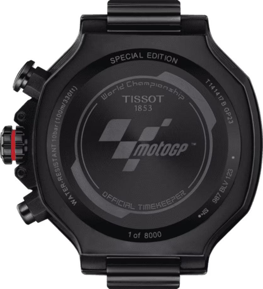 Tissot Watch T-Race MotoGP Chronograph Limited Edition 2023 T1414173705701. The thrills of MotoGPTM and the passion of Tissot for motor sports cannot be separated. To honour this partnership, the T-Race MotoGP watch celebrates the excitement of racing – and for 2023, this Tissot classic has been given a new set of colours. The timepieces are crafted with the same detail and expertise shared by watchmakers, motorbike mechanics and riders. Directly inspired by this sport pairing passion with innovation, the T-Race MotoGP Limited Edition 2023 was designed with meticulous detailing. With one eye always on the clock, precision is the common ground between Tissot and MotoGP riders. The large, red arabic numbers on the dial were imagined as a nod to motorcycle racing numbers, while flashy red details give the impression of speed. The MotoGP logo is engraved on the caseback. With its speedometer-inspired chronographs, the brake disc and calibre on the bezel, the pushes inspired by handlebars, and engine cooling fins depicted on the side of case, this watch was imagined as a real homage to the discipline. Last but not least, as the last allusion to MotoGPTM, these watches come packaged in mini helmets.