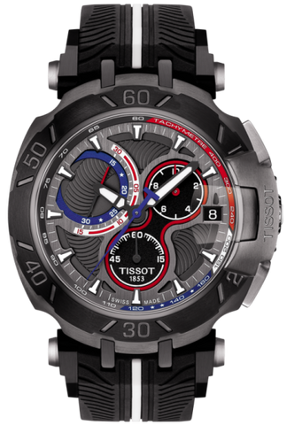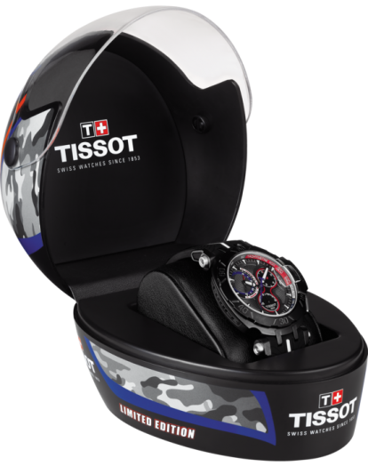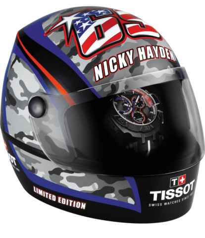 Tissot Watch T-Race Nicky Hayden 2017 Limited Edition T0924173706101. This limited edition stays true to the Tissot T-Race essence, with features that represent the motorcycle. The bezel design is inspired by a break-disc and the dial further illustrates tyre treads with special engravings, adding extra depth to the piece. The Tissot T-Race Nicky Hayden Limited Edition 2017 will only be produced in 2017 pieces. Attesting to the uniqueness of the watch is Nicky Haydens race number and logo silk-printed on the caseback and its special helmet presentation box.