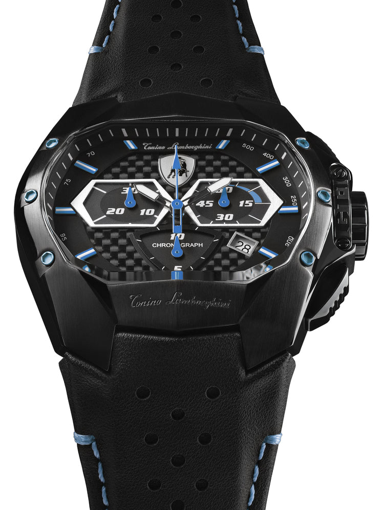 Tonino Lamborghini Watch GT1 Blue T9GC. The GT1 quartz chronographs take their name from touring car models and are strongly inspired by the heritage of the brand. In fact, details like the sub dials strongly recall the speedometer of a car, while the START/STOP pushers of the chronograph are inspired by the sport cars acceleration and brake pedals, pure homage to the automotive and mechanical DNA of the Lamborghini family.