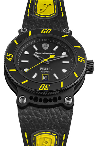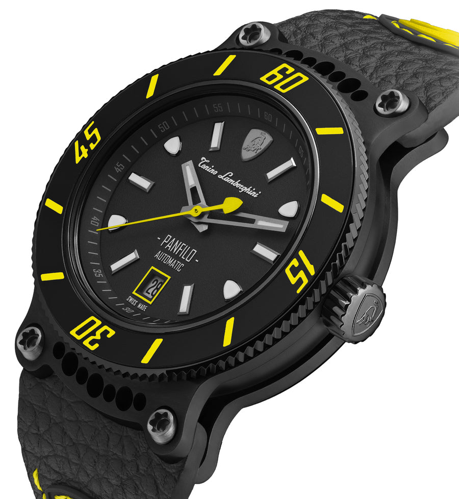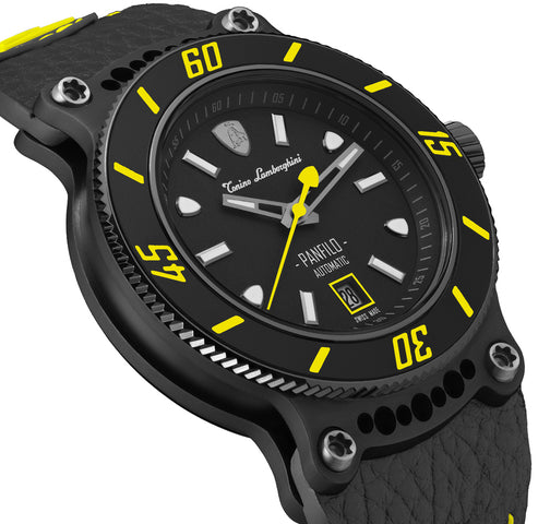 Tonino Lamborghini Watch Panfilo Black Yellow TLF-T03-5. The Tonino Lamborghini brand has dedicated its first sub diver watch to the sea enthusiasts, people who pursue in water the same challenges and goals they chase on the road. The slanting numbers and indexes on the unidirectional rotating bezel add a touch of dynamism and vitality to this timepiece that guarantees a firm grip when submerged in the aquatic world. The design of the titanium sandwich case, with original holes in the lugs inspired by the sport car frames and four visible Torx screws, is a clear tribute to the automotive heritage of the brand.