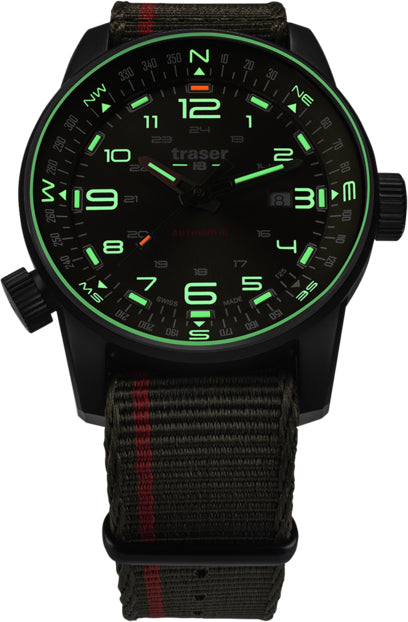 Traser H3 Watch P68 Pathfinder Automatic Green 110456. rom the beginning, traser has pioneered the utmost innovation and always pushed limits of what is possible. Already in 1989, after a period of intensive research and engineering, the traser P6500 Type 6 was developed. This was the first self-illuminated watch ever produced. THE ORIGINAL. The P6500 Type 6 was supplied to the US Army, which defined the brand‘s personality and had a great impact on what it stands for today. The Tactical collection incorporates traser‘s roots with highly resistant materials, uncompromising functionality, robust design and a strong appearance. Keeping the tactical spirit alive. The reliable companion for professionals, adventurers and explorers.