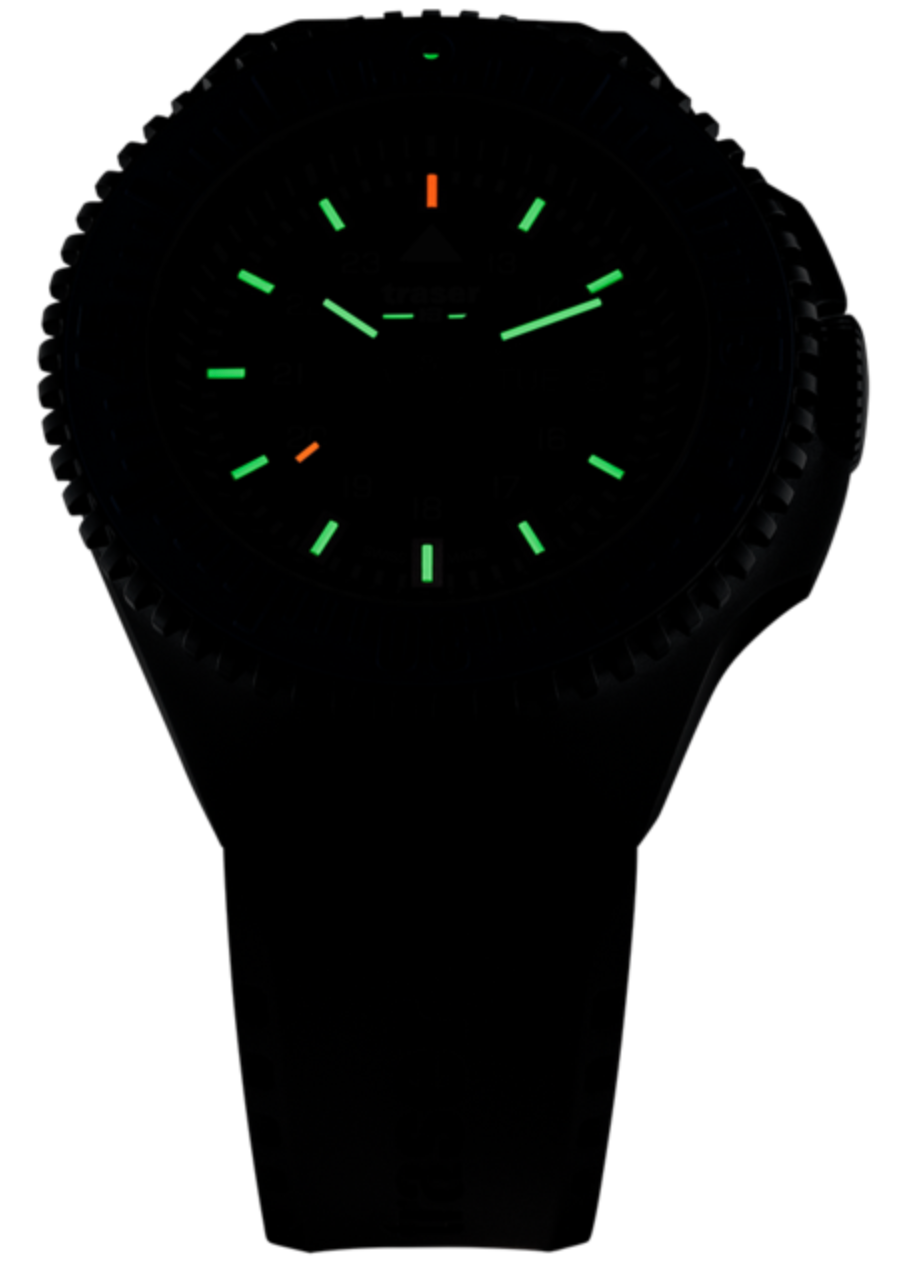 Traser H3 Watch P69 Black Stealth Blue Rubber 109857. Traser H3 timepieces are mostly known as top military watches. They are made in Switzerland and the history of the company dates back to the 1970s. One of Traser H3’s most unique features is the utilisation of Gaseous Titanium Light Sources (GTLS).