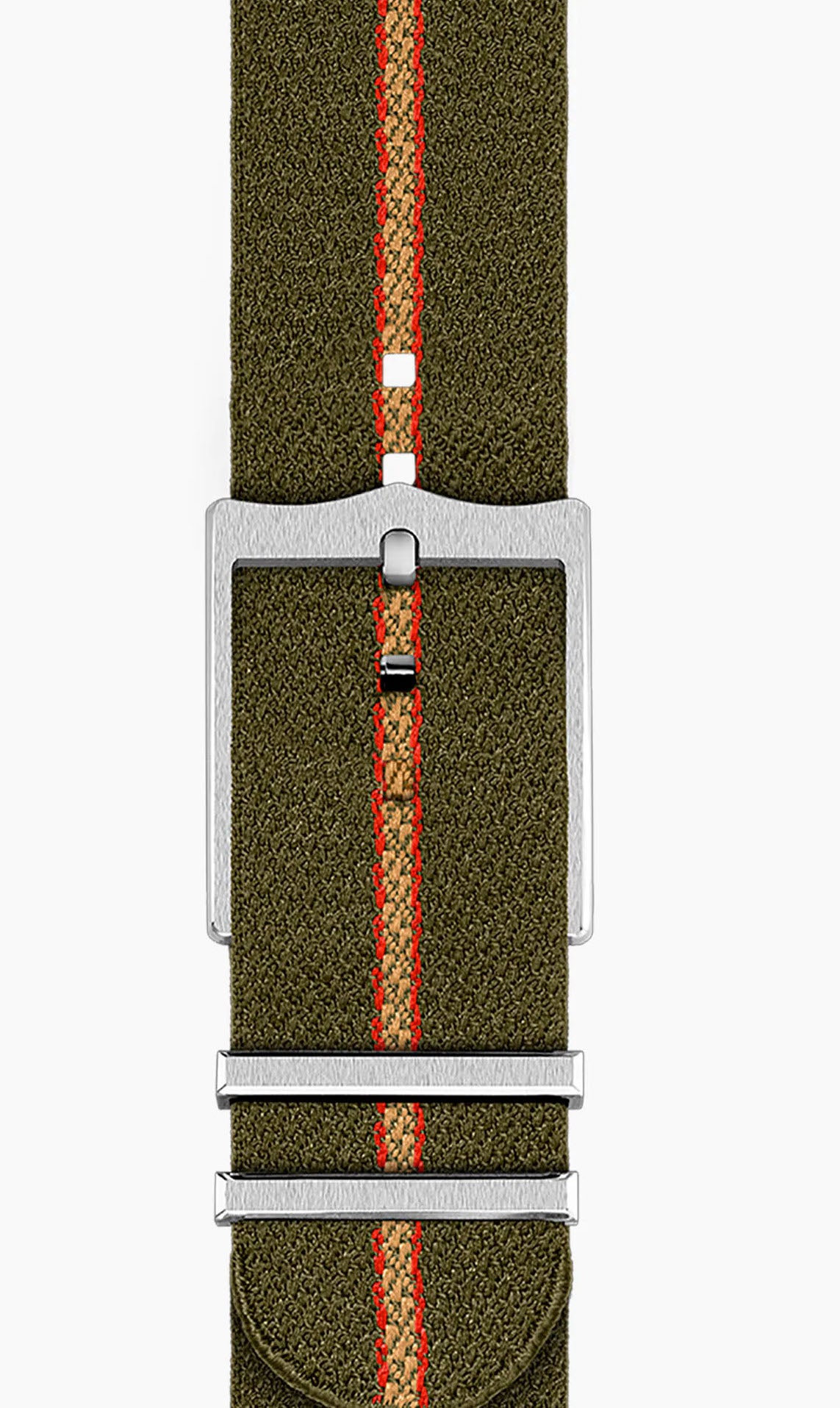 - Olive green fabric strap with beige and red stitching