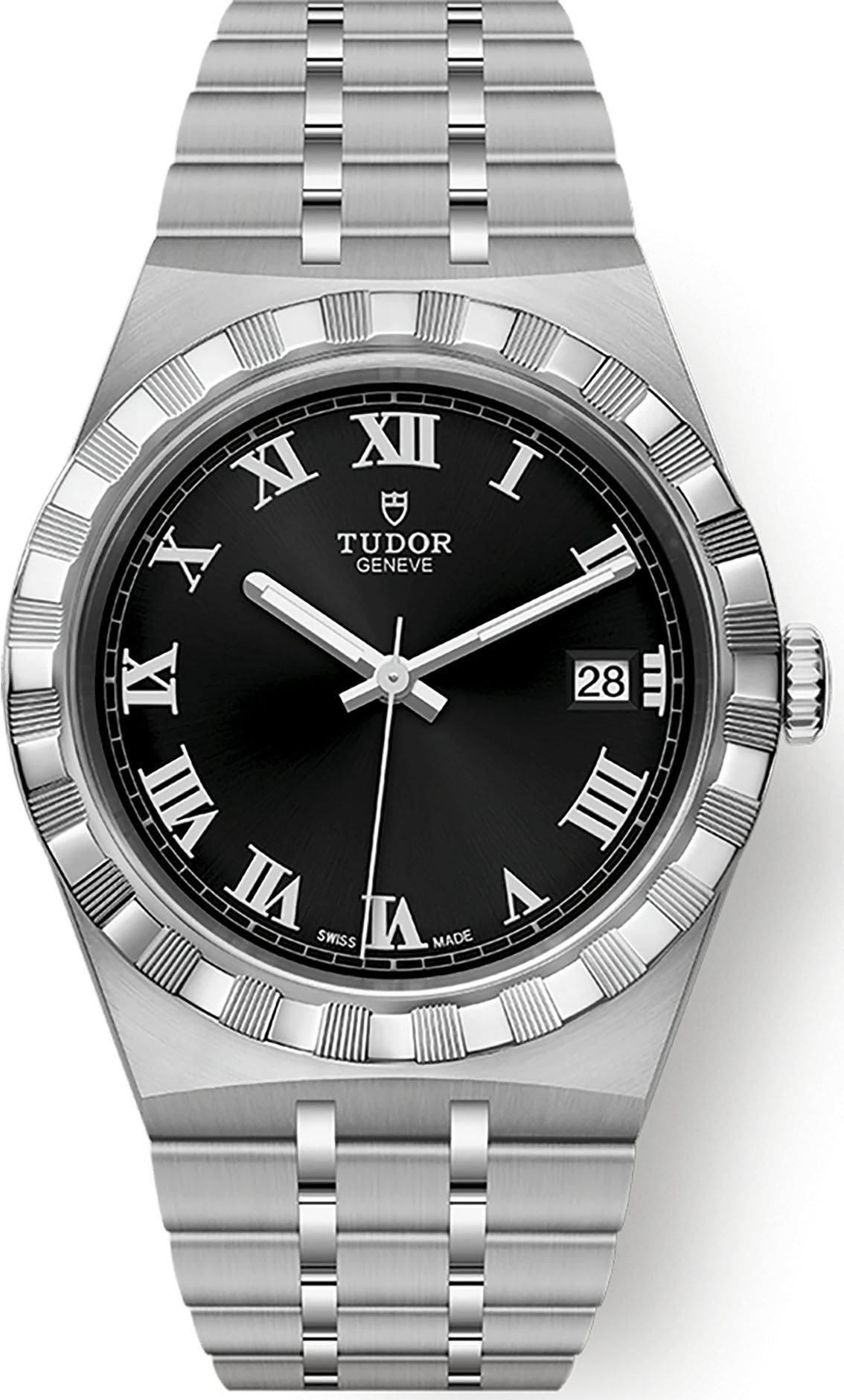 The Classic black and steel TUDOR Royal watch wins every time. Characterised by its traditional hour track represented by Roman numerals, the watch promises to compliment any attire no matter what the occasion. This unisex TUDOR Royal watch reference M28500-0003 measures a 38mm diameter, making it ideal for male and female TUDOR watch fans alike. Its rich black dial gives way to a set of slender central hour and minute hands treated with luminous material and a fine seconds hand. Aside from the Roman numeral hour markers the dial of this TUDOR Royal watch also features a date window at 3 o’clock and the TUDOR Geneve lettering and shield at the top of the display. The elements on the dial are all protected by a piece of anti reflective and scratch resistant sapphire crystal glass, which rids the dial of any undesirable glare when wanting to reference the time.