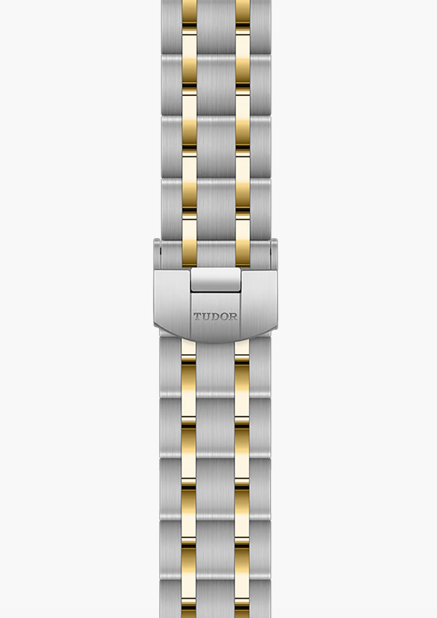 To keep the TUDOR Royal watch reference M28303-0002 ticking over perfectly., TUDOR equips this elegant sports watch with a Manufacture movement that, once fully wound, can provide a power reserve of 38 hours. Finishing elements include a luxurious stainless steel and yellow gold capped bracelet and a screw down crown meticulously engraved with the TUDOR logo.