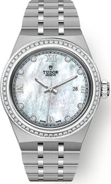 Adding further opulence to this TUDOR Royal watch reference M28320-0001, round brilliant-cut diamonds occupy some of the locations of the hour track. The remaining locations are represented by traditional Roman numeral hour markers for a classic and traditional look. The Royal watch by TUDOR is powered by the Calibre T201, which provides a power reserve of 38 hours and comes fitted on a stainless steel bracelet. The 5 row integrated bracelet secures to the wrist with a folding clasp and safety catch to ensure uncompromised comfort.