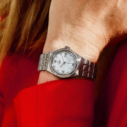 Epitomising affordable luxury and a chic, sporty personality, the TUDOR Royal watch is by far one of the most popular lines created by the Genevan based manufacturer. The TUDOR Royal watch reference M28320-0001 showcases a captivating mother of pearl dial, framed by a stainless steel case that measures a 26mm diameter. Ergonomically developed for comfort on the wrist, this lady’s Tudor watch combines superior materials with expert craftsmanship. A row of meticulously set round brilliant cut diamonds is positioned around the bezel of this elegant lady’s dress watch, enticing light to ignite the shimmering iridescent shades of the mother of pearl display. The TUDOR Royal watch also features luminous central hour and minute hands and a date feature at 3 o’clock.