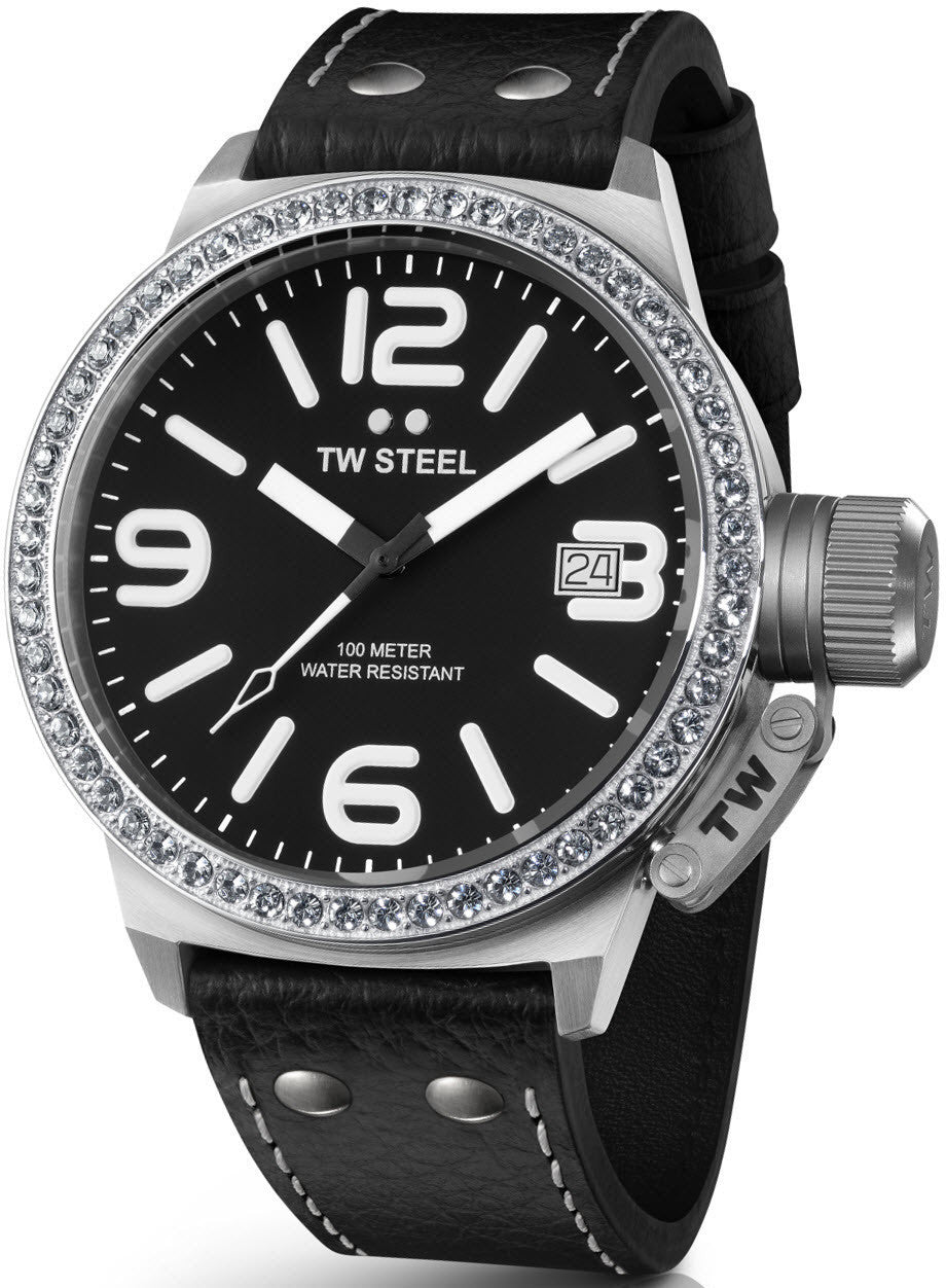 TW Steel Watch Canteen. The Canteen Style collection is readily identifiable by the cases featuring the hook crown cap and the leather straps with the two steel dots. The Canteen models embody TW Steels oversized DNA while continuing to evolve with sleek, modern designs.