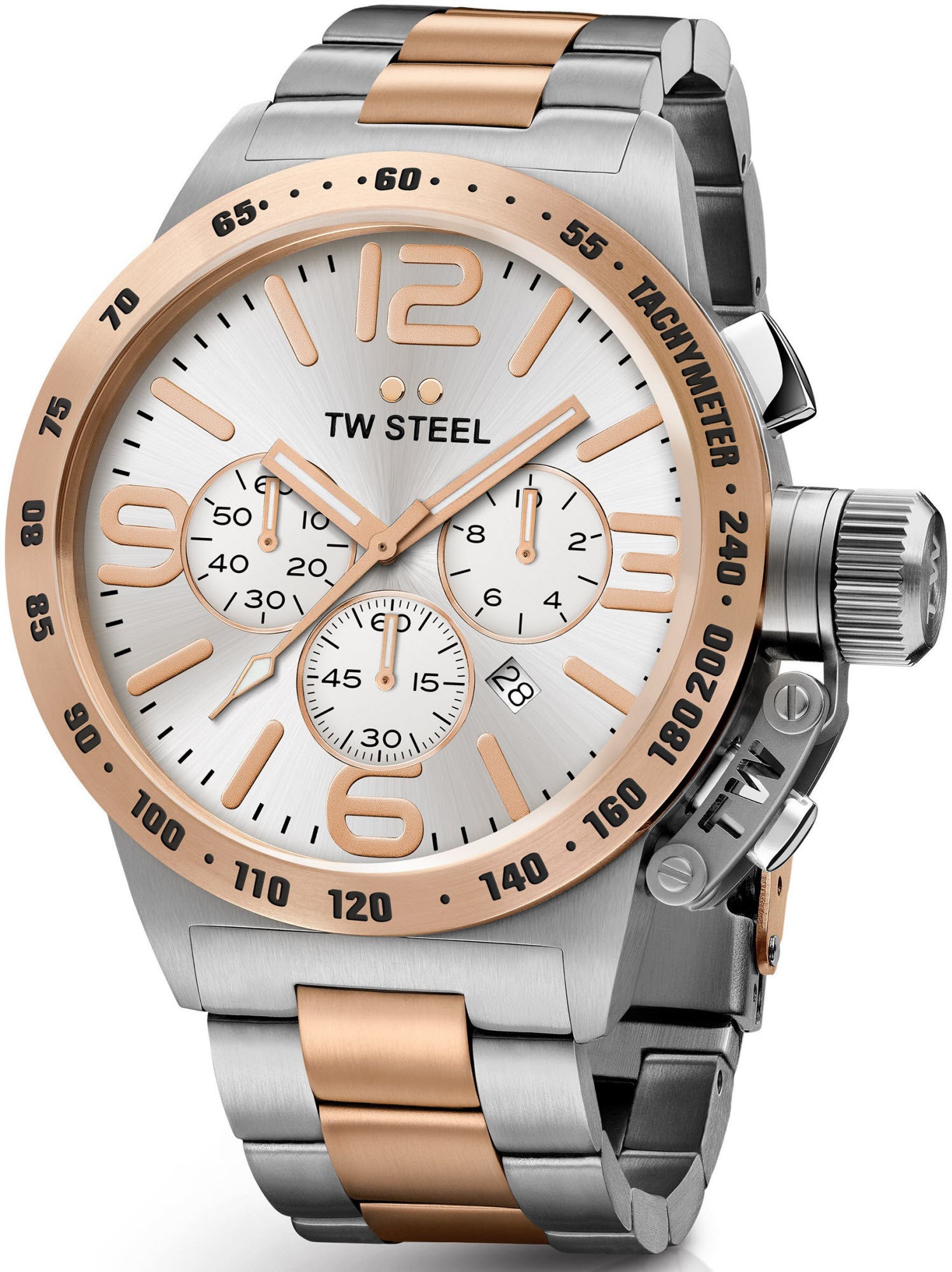 The exquisite two toned 316L stainless steel and rose gold PVD plated case of the TW Steel Canteen watch brings a look of sophistication and intricacy to the timepiece while housing the 6S20 chronograph movement. The crisp sunray effect silver dial is set with rose gold PVD numerals, indices. chronograph dials and a date feature at 4 o clock which sit beneath the reinforced mineral crystal glass coated with a layer of sapphire. The stainless steel bracelet is decorated by PVD rose gold plated mid pieces to complete the polished two toned design.