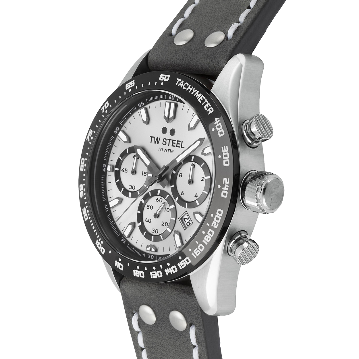 TW Steel Watch Chrono Sport CHS3. TW Steel watches Sportive, stylish with a retro twist. This CHS3 features a 46mm steel case with a PVD dark titanium coated bezel, a silver white dial, 10ATM and a dark grey leather strap with a steel clasp.