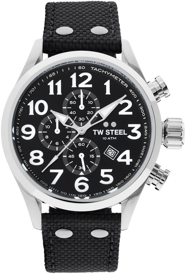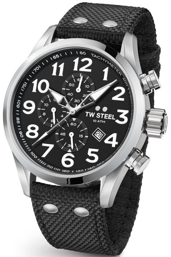 TW Steel Watch Volante Mens VS3. Inspired by driving and racing, this Volante model features a 45mm steel case with a black dial, is powered by a chronograph movement and stands out with a black premium quality textile strap.