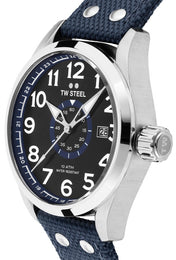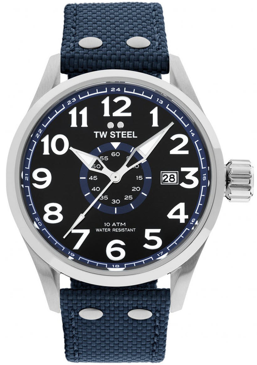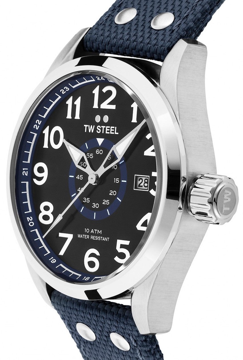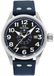 TW Steel Watch Volante Mens VS31. Inspired by driving and racing, this Volante model features a 45mm steel case with a black dial and stands out with a dark blue premium quality textile strap.