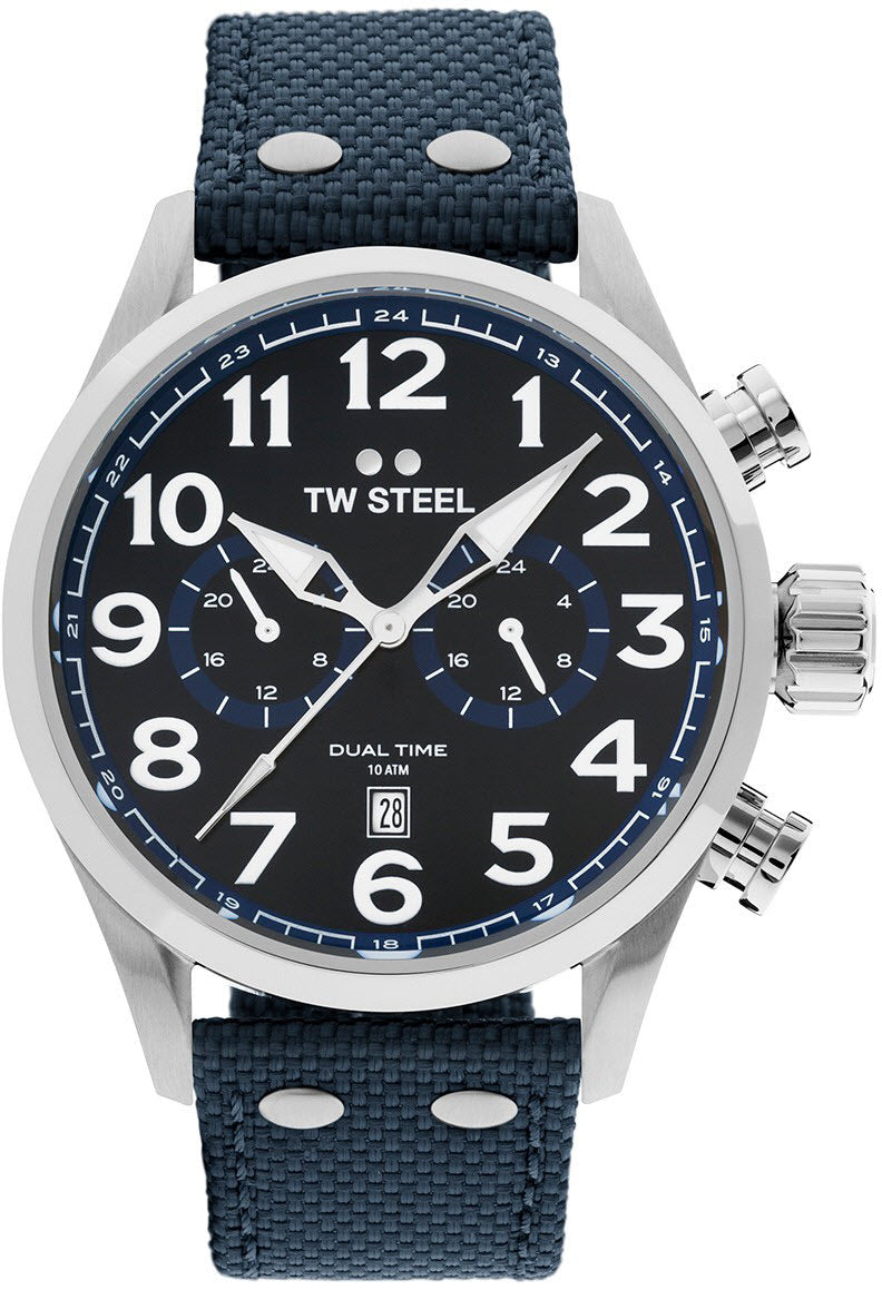 TW Steel Watch Volante Mens TWVS38. Inspired by driving and racing, this Volante model features a 48mm steel case with a black dial, is powered by a dual time movement and stands out with a dark blue premium quality textile strap.