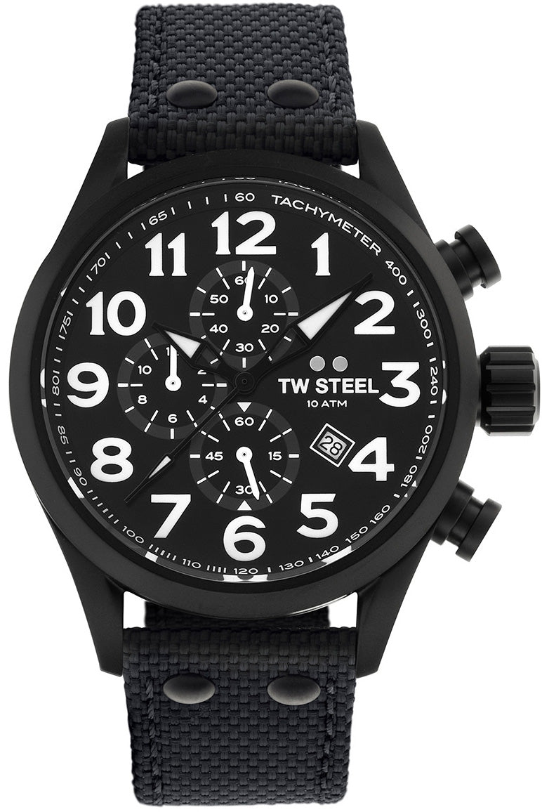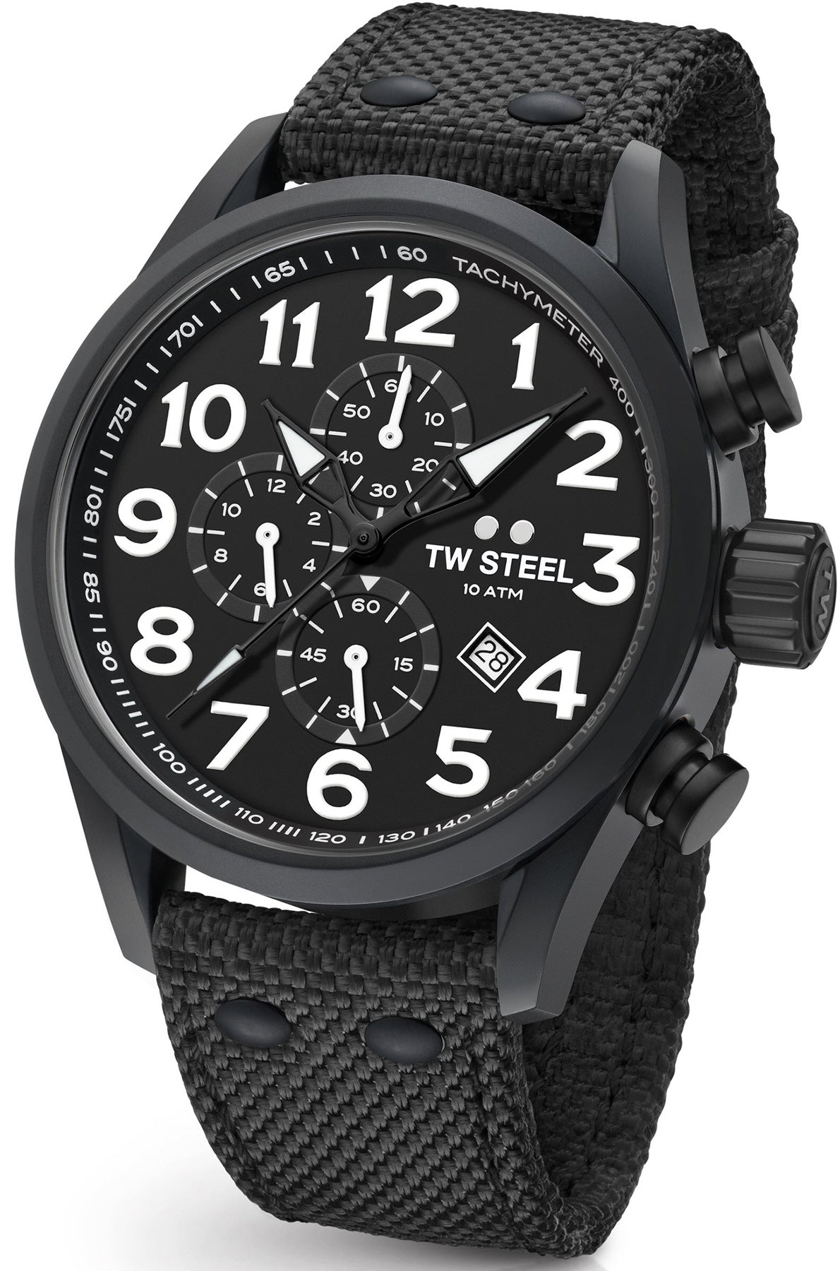 TW Steel Watch Volante Mens TWVS43. Inspired by driving and racing, this Volante model features a 45mm sandblasted black coated case with a black dial, is powered by a chronograph movement and stands out with a black premium quality textile strap.