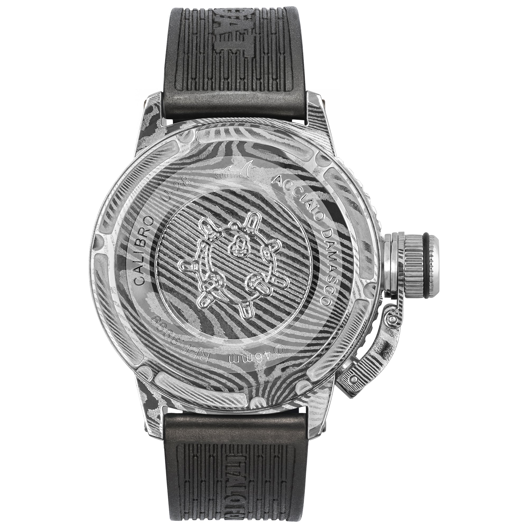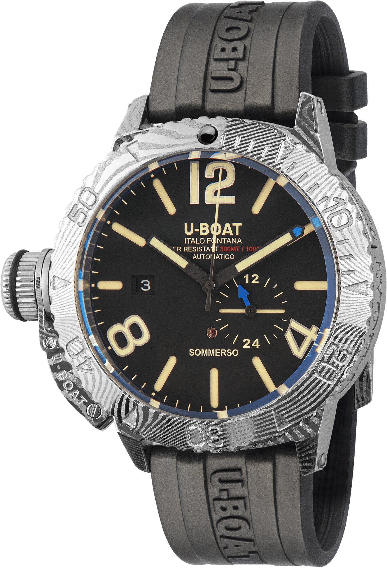 U-Boat Capsule Sommerso Damascus Watch 9999. The diver Sommerso model challenges the depths with an elegant Damascus steel case. Its fascinating aesthetic effect covers it entirely, not neglecting the rotating bezel and the case back.