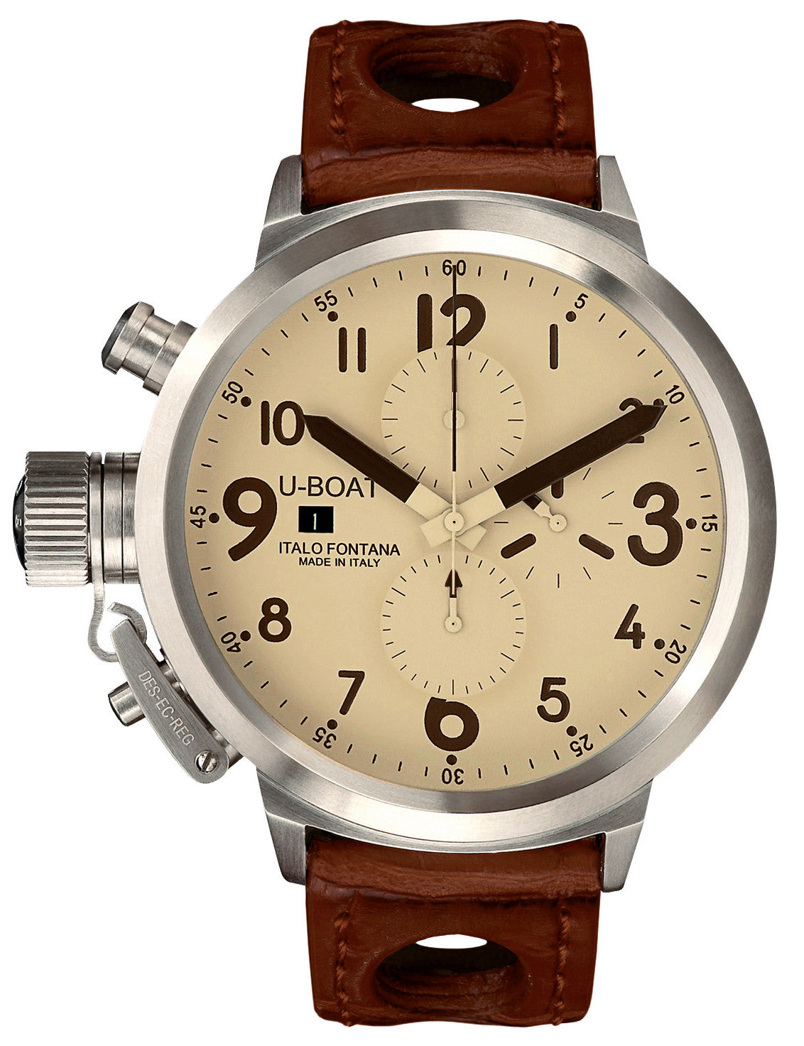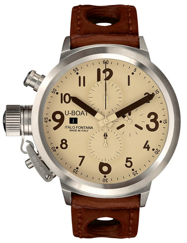 The CAS BE is an iconic watch at U-BOAT. It stands for the mix of materials and the use of rugged 316L Steel. Maintaining the patented Left-Hook on all U-BOAT watches, this watch is as elegant as it is robust. The tan alligator strap with its aero design holes are a trademark of the brand and as much as they make the watch appear smart, it does not detract from the watch's 100m water-proofing and exhibition window. Also Available in 43mm