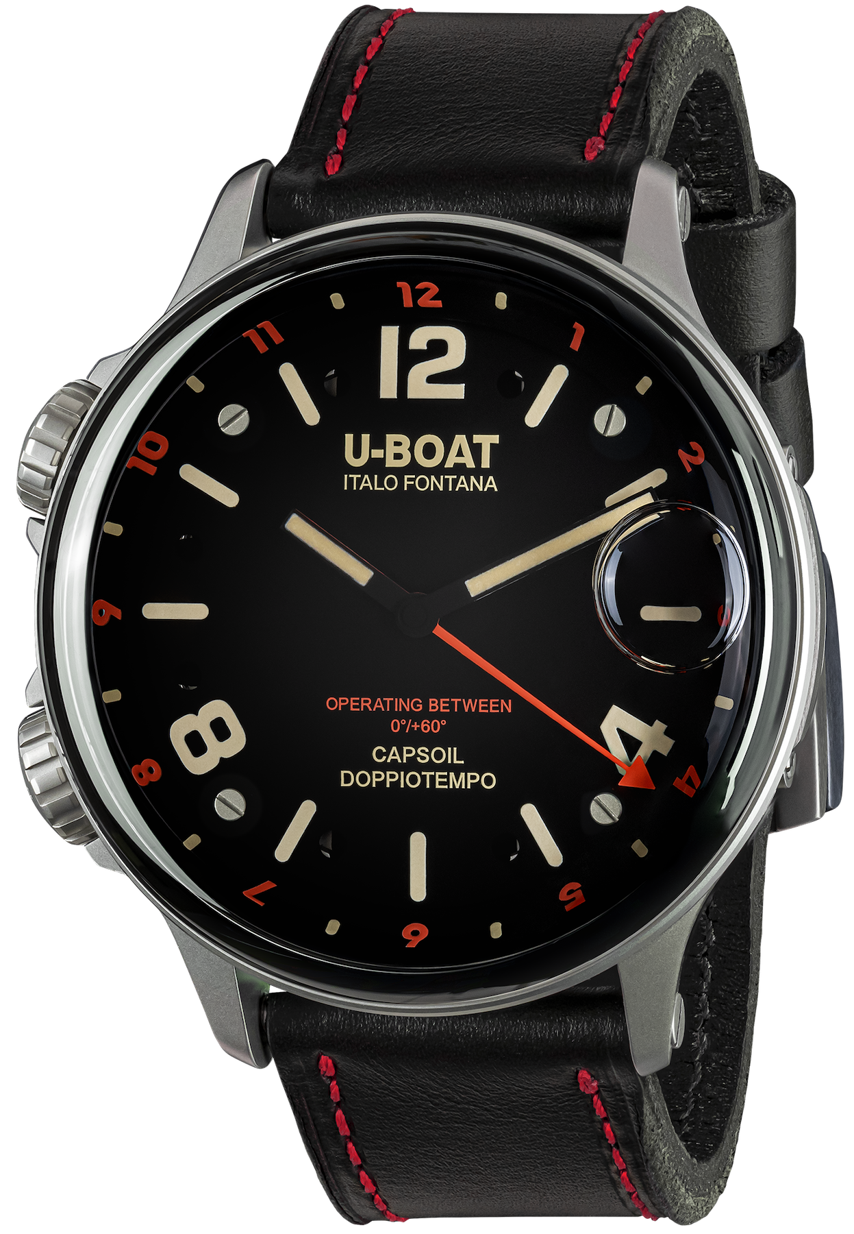 U-Boat Watch Capsoil Doppiotempo 55 Red Rehaut SS 9674. Since the beginning, Italo Fontana, U-BOAT's designer, has accustomed us to big wristwatches. Today, he has converted one of his latest and acclaimed creations, the Capsoil Doppiotempo, into a range of 55mm.