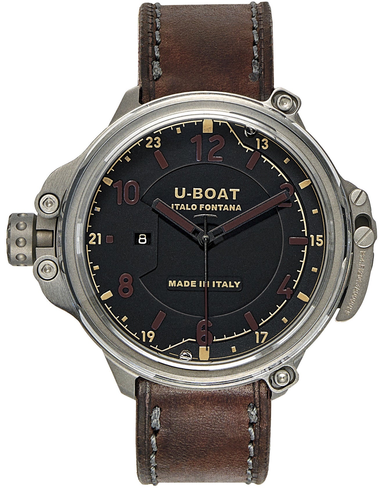 U-Boat Watch Capsule Black Limited Edition with PLEXI GLASS. Inspired directly by the first undersea exploration modules, Capsule is the latest creation designed by Italo Fontana. Fascinated by depth gauges made in the early 1930s, Italo designed this watch with their characteristic features in mind, from the rounded shape to the porthole windows with water pressure resistant glass to ensure that the people inside the cabin survived the dive. These spherical portholes made from strong glass were clamped to the outside surface of the capsule using a system of levers to ensure water resistance. U Boat watches uses a patented system to clamp the glass of the Capsule to the grade 5 titanium case, featuring a system of external fixing levers guaranteed to withstand the pressure exerted by both outside and inside agents. The two main levers of the U Boat Capsule 50 Black Plexi Limited Edition, locked in place by a third one positioned at 3 o clock and by special safety screws, press the domed glass in hesalite against the waterproof gasket beneath. This system secures the watch in the event of pressure changes.The entire process of opening and removing the glass can be performed without dismantling any of the watchs main components. Supplier model number 7469/P