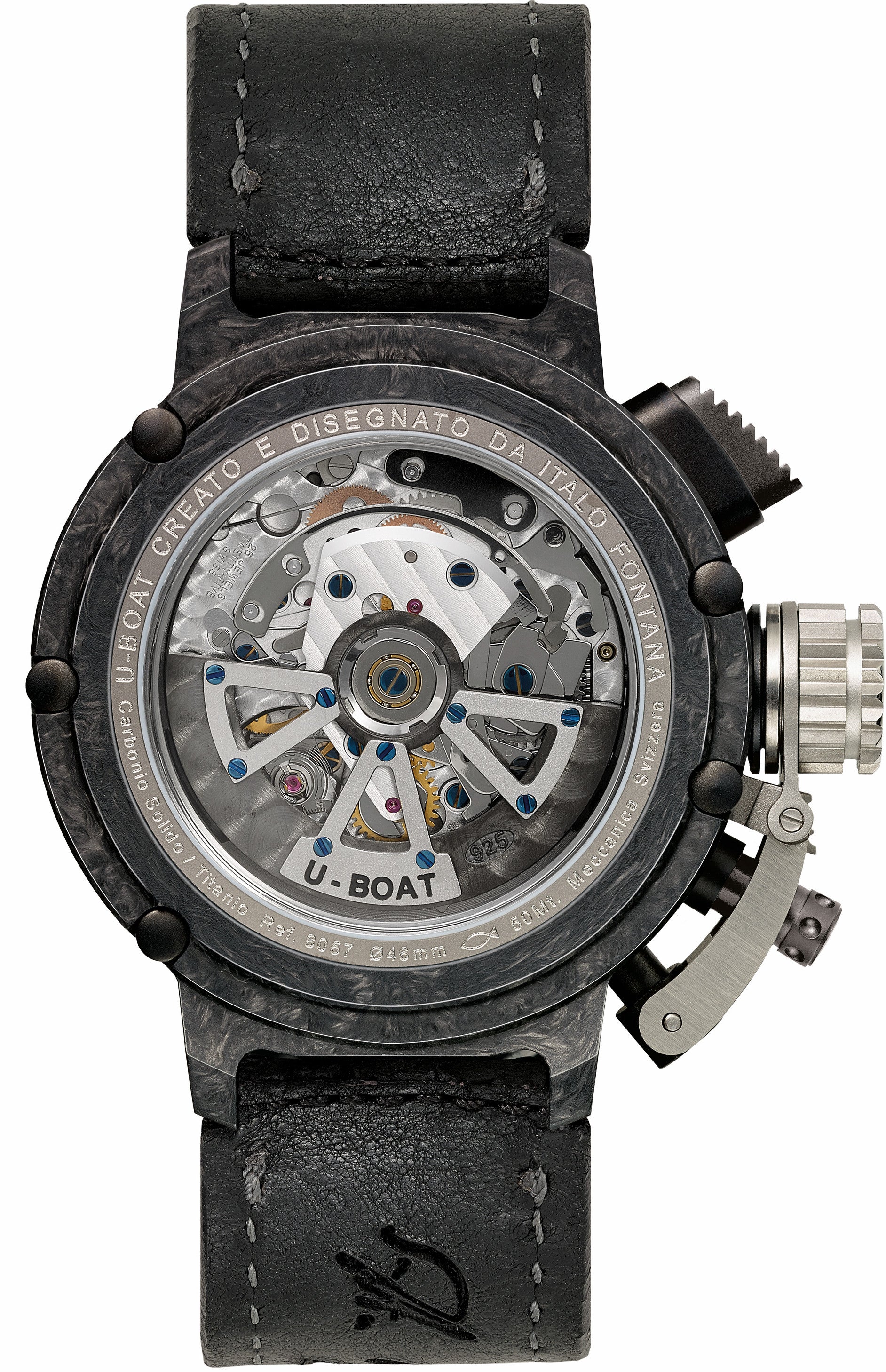 U-Boat Watch Chimera 46 Carbonio 8057. The distinguishing feature of the U-Boat Chimera collection is the iconic case with its striking crown cap and pushers. These watches have a strong personality and embody Italos passion for Vintage Culture. With peerless clarity of design, U-Boat watch Chimera has a profoundly clean appearance and a very masculine character. The bezel and case back are locked together by external tubing and a customized key that ensures total waterproofing. Five screws hold the bezel, case band and case back firmly together and the oversized crown cap for easy handling is secured to the carrure.