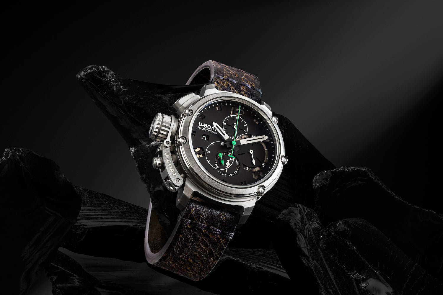 U-Boat Watch Chimera Chronograph Green Steel Limited Edition 8528. The distinguishing feature of the U-Boat watches Chimera collection is the iconic case with its striking crown cap and pushers. These watches have a strong personality and embody Italos passion for Vintage Culture. With peerless clarity of design, Chimera has a profoundly clean appearance and a very masculine character. The bezel and case back are locked together by external tubing and a customized key that ensures total waterproofing. Five screws hold the bezel, case band and case back firmly together and the oversized crown cap for easy handling is secured to the carrure.