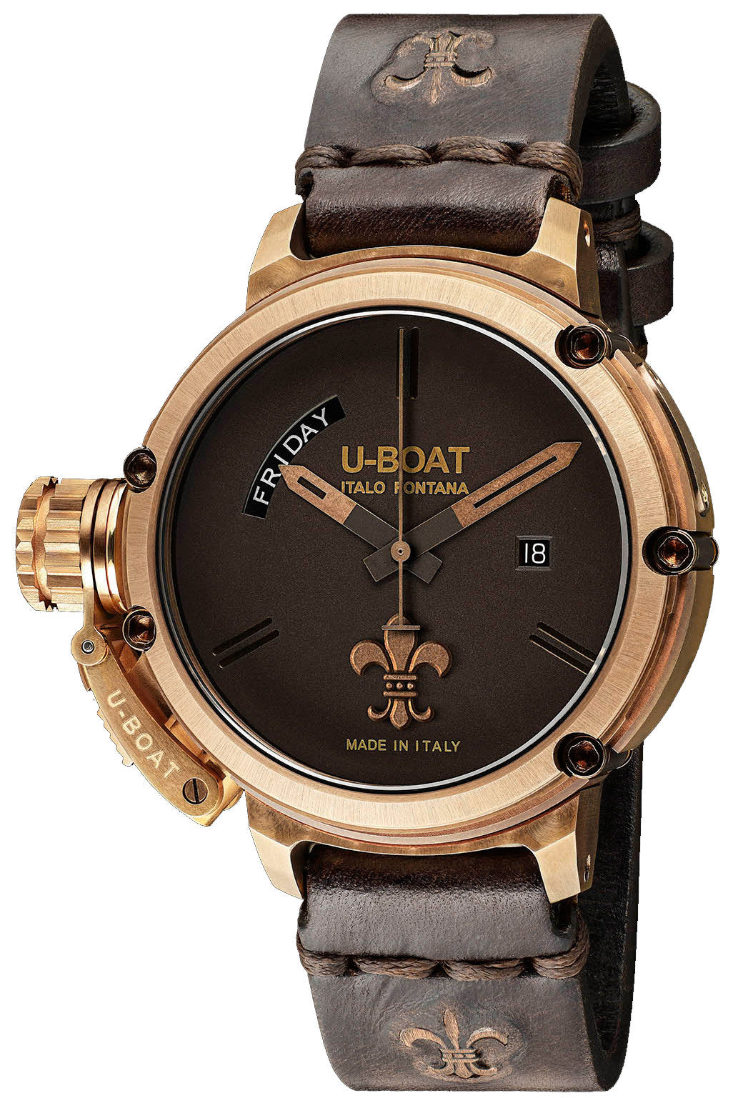 The U Boat Chimera Day Date Giglio watches most distinctive feature is the fleur de lis crest that is set on the dark brown dial and the matching brown calf leather strap. This fleur de lis crest is usually associated with royalty and wealth, reflecting the very quality of the U Boat watch itself. The dial is decorated with laser cut hour and minute hands as well as a bronzed coloured second hand to match the rest of the design.