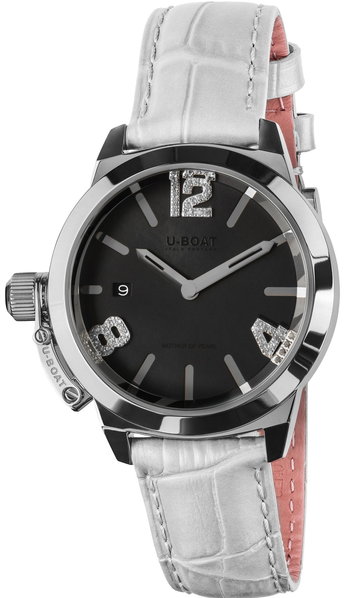 U-Boat Watch Classico 38 Black 8482. A reinterpretation of the Classico model in an exquisite female version, enriched with 42 white sapphires set on the indexes and an iridescent black mother of pearl dial.