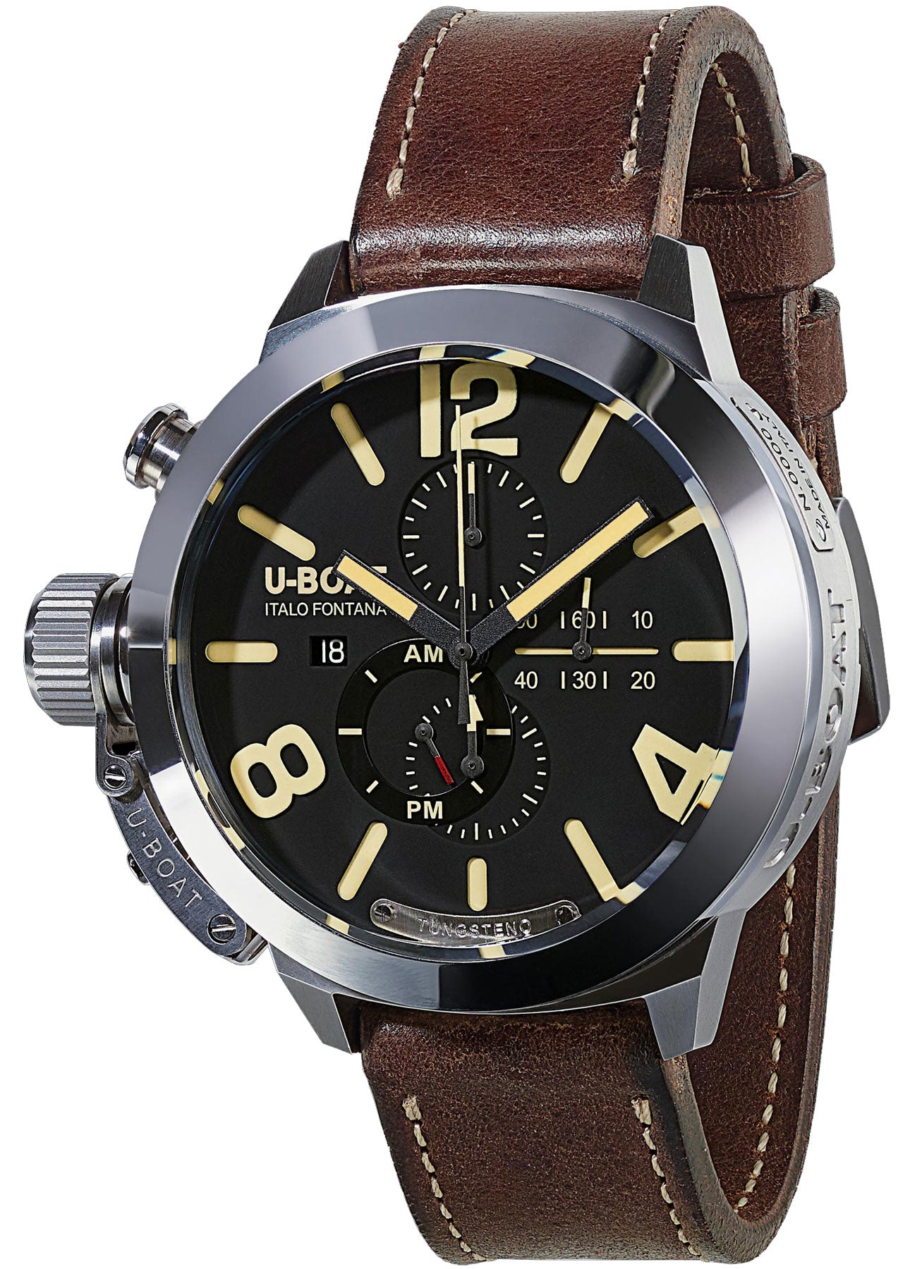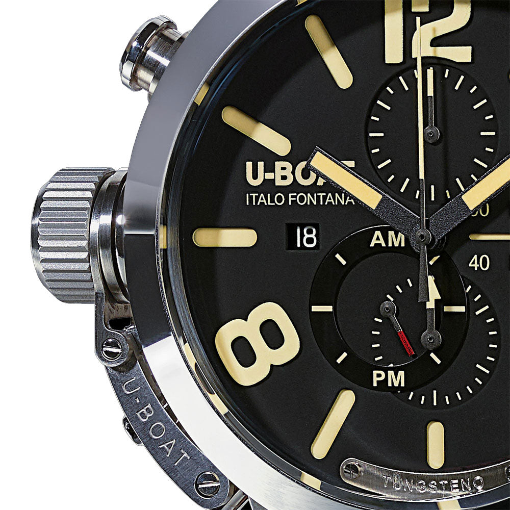 U-Boat Watch Classico 50 Tungsten CAS 1 Movelock 8077. U-Boat watches, just like their original namesake, are bold, aggressive and oversized. These timepieces embodied force and style and revealed the unique personality of the man behind the revival, Italo Fontana. The Classico Chrono 50 boasts a tungsten bezel with polish finishing. The back is sealed with seven external screws, with an opening U-shaped sapphire fum crystal with movement view. Handmade and hand finished dark brown calf leather.