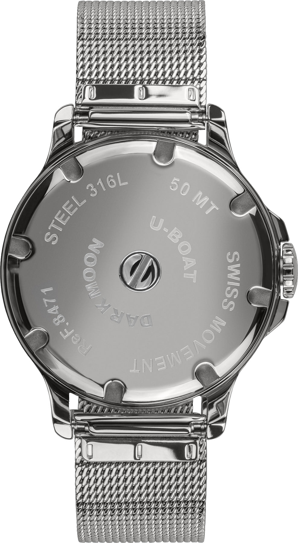 U-Boat Watch Darkmoon 38 SS Bracelet 8471/MT. A collection inspired by the dark side of the moon. The steel case is completely filled with a special oil that emphasizes the dial creating a more intense black effect and greater readability. Rounded iridescent mineral glass that creates a rainbow effect.