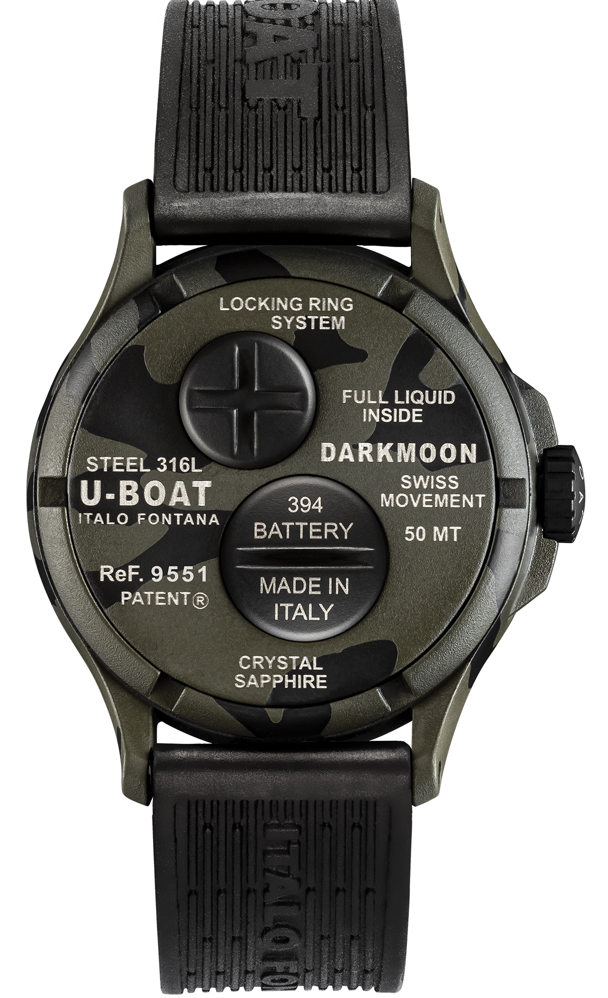 U-Boat Watch Darkmoon 40 Camouflage Grey Curve Black 9551. The Darkmoon watches feature an electromechanical movement completely immersed in an oil bath, with a compensating bubble, which provides an amplified view of the dial for the wearer as if there were no glass. U-BOAT launches this new range of watches with a new curved dial, under the domed sapphire glass, further emphasizing the 3D effect.