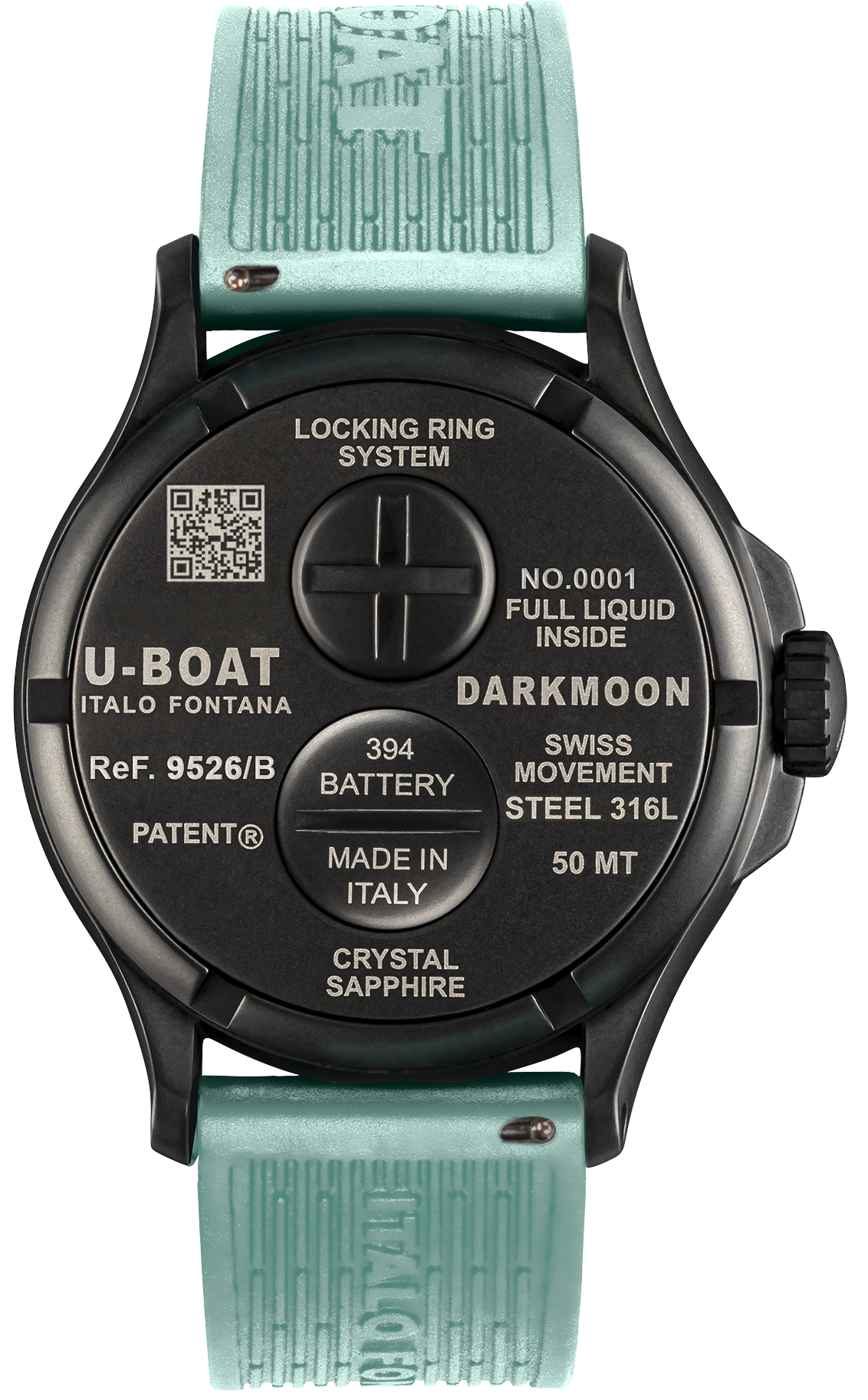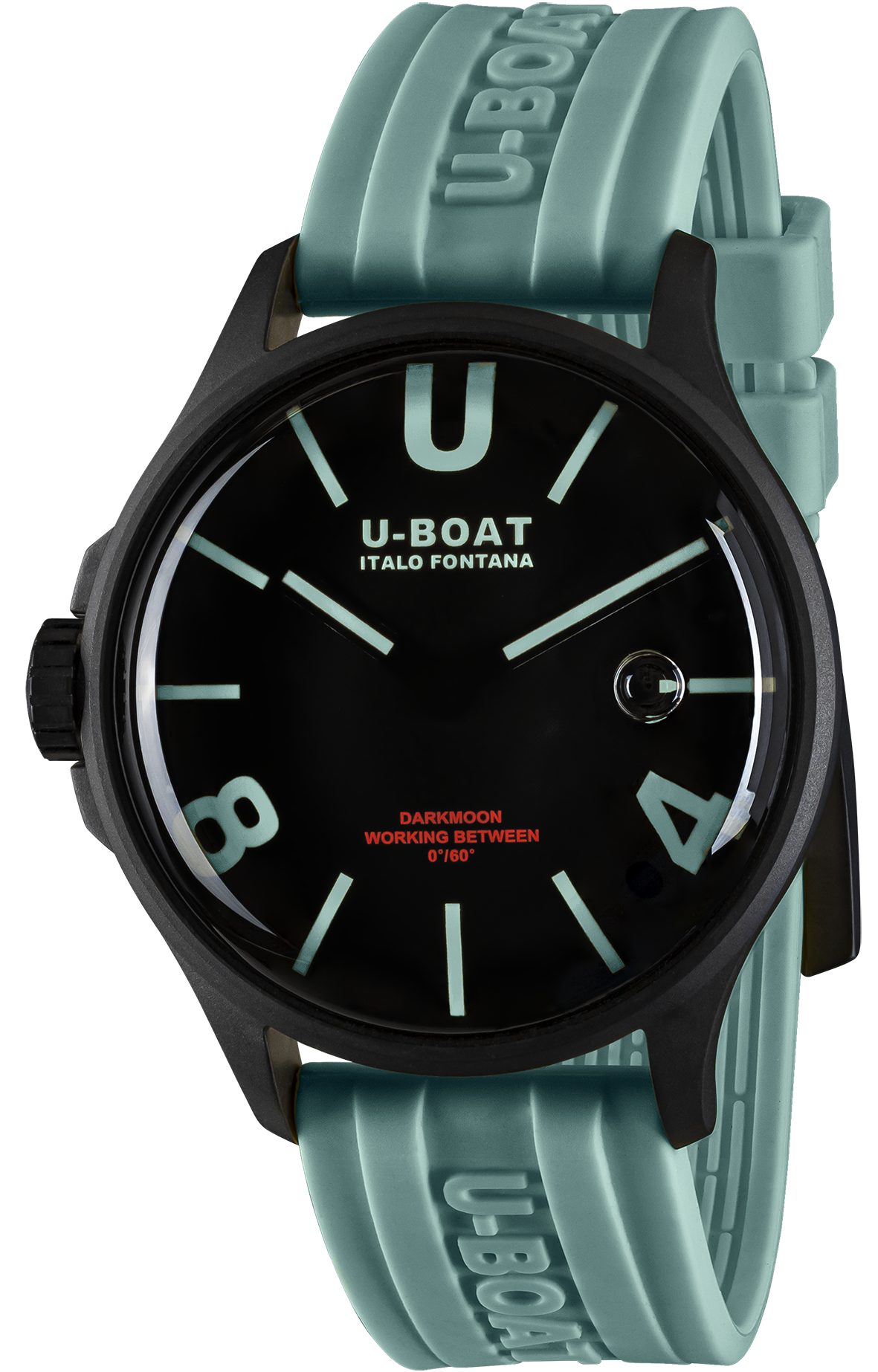 U-Boat Watch Darkmoon Black Aquamarine Curve PVD 9526/B. The Darkmoon watches feature an electromechanical movement completely immersed in an oil bath, with a compensating bubble, which provides an amplified view of the dial for the wearer as if there were no glass. U-BOAT launches this new range of watches with a new curved dial, under the domed sapphire glass, further emphasizing the 3D effect.